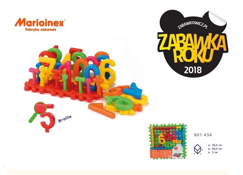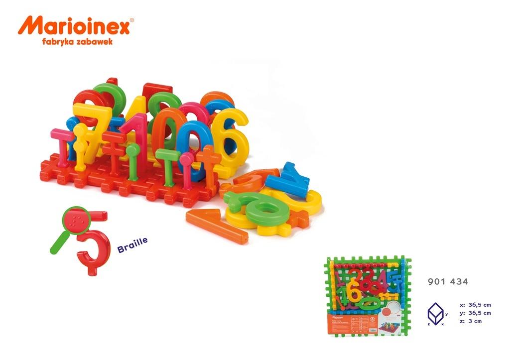 Zestaw klocków konstrukcyjnych Świat Cyfr Mini składający się z 22 elementów: 1x podstawa, 10x cyfry, 5x znaki działań, 6x klocki.