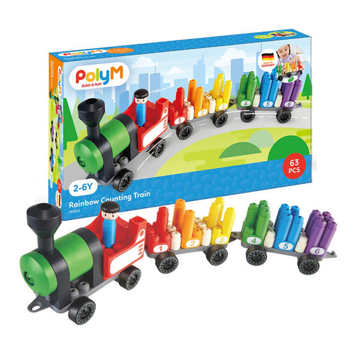 Klocki konstrukcyjne, tęczowy pociąg do liczenia, 63 el., 2+, PolyM