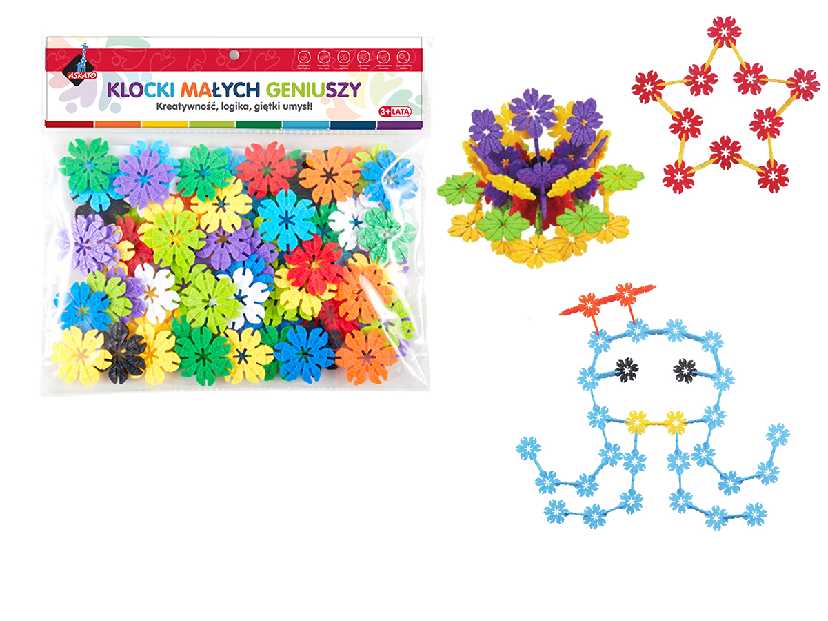 80 elementów w 10 kolorach pozwala stworzyć fantastyczne figury, zaczynając od tych prostych takich jak gwiazdka czy parasol poprzez nieco trudniejszą ośmiornicę lub samolot.