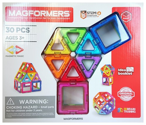 MAGFORMERS BASIC 30 to klocki z wbudowanymi silnymi magnesami neodymowymi, które zawsze się przyciągają. Wystarczy zbliżyć do siebie ściankami dwa klocki, a one natychmiast ze sobą się połączą. Za pomocą klocków wzorowanych na kształt figur geometrycznych można zbudować wspaniałe trójwymiarowe budowle. W zabawie można korzystać z dołączonej do zestawu instrukcji lub innych przykładów zamieszczonych na stronie producenta lub własnej wyobraźni. W skład zestawu wchodzi: 12 trójkątów; 18 kwadratów.
