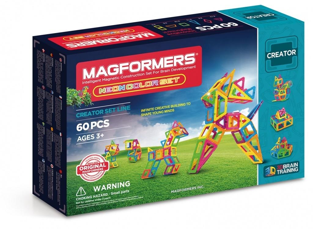 Magformers to klocki z wbudowanymi silnymi magnesami neodymowymi. Za pomocą figur geometrycznych można zbudować wspaniałe trójwymiarowe budowle, począwszy od prostych figur, skończywszy na pomysłowych budowlach. Magformers to kreatywne klocki, które dają nieograniczone możliwości zabawy. Klocki kształtują i rozwijają wyobraźnię przestrzenną dziecka oraz logiczne myślenie. MAGFORMERS CREATOR NEON COLOR SET 60P zawiera klocki w żywych neonowych kolorach. Rozwija kreatywność dziecka.
