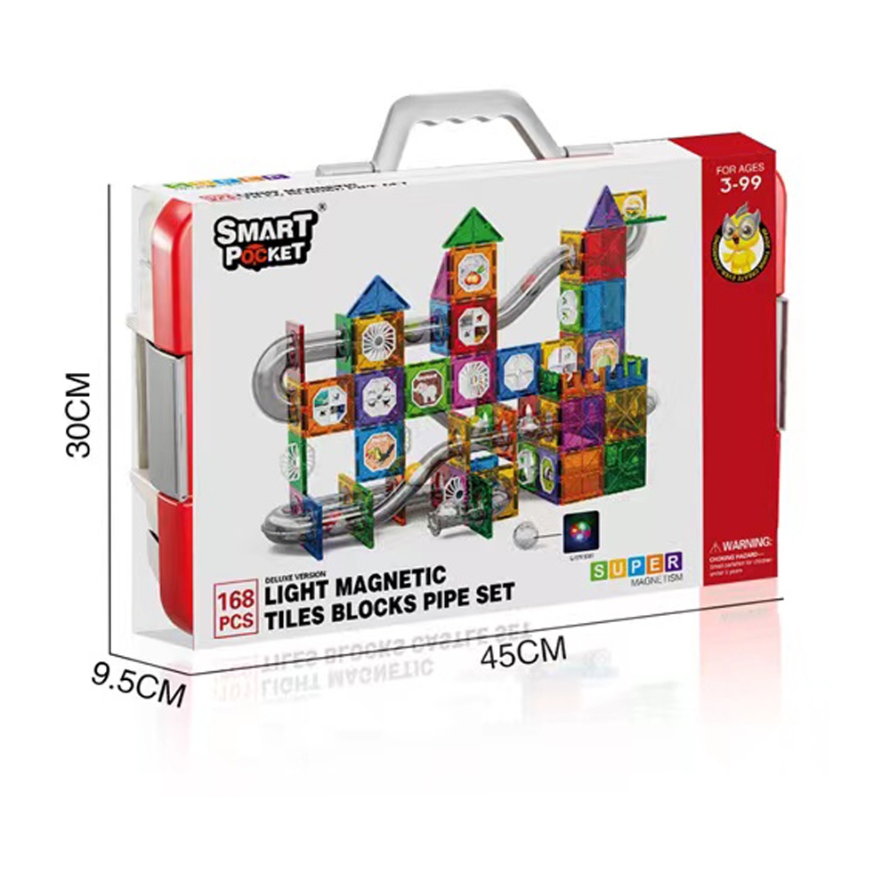 Duży zestaw świecących klocków magnetycznych. Zawiera 168 elementów. Świecąca kulka. Wymagane baterie: 1xGR1220 (dołączone). Wymiary opakowania: 45 x 9,5 x 30 cm