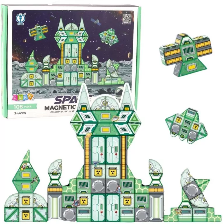 KLOCKI MAGNETYCZNE SPACE 108 ELEMENTÓW Klocki magnetyczne kosmos 108 elementów to doskonały zestaw konstrukcyjny dla najmłodszych odkrywców kosmosu. Inspirowane tematyką galaktyczną klocki o futurystycznych kształtach i wzorach pozwalają na tworzenie stacji kosmicznych, baz badawczych, pojazdów i nie tylko. Klocki wykonano z wytrzymałego tworzywa i wyposażono w silne magnesy, co zapewnia trwałość i wygodę podczas łączenia elementów. Powierzchnia typu 4D Diamond Surface efektownie odbija światło, nadając konstrukcjom nowoczesny, błyszczący wygląd. Dziecko znajdzie w zestawie nie tylko klasyczne kształty - jak kwadraty czy trójkąty - ale również wyjątkowe elementy dekoracyjne, naklejki z robotami, rakietami i astronautami, co dodatkowo pobudza wyobraźnię i kreatywność. Zestaw wspiera rozwój logicznego myślenia, koordynacji wzrokowo-ruchowej oraz zdolności manualnych. To świetna zabawka edukacyjna, która łączy przyjemność z nauką i daje dziecku możliwość tworzenia własnego kosmicznego świata. SPECYFIKACJA: Wymiary opakowania: 30 x 24 x 7 cm Liczba elementów: 108 Rodzaj klocków: magnetyczne, wielokształtowe Rodzaje figur: kwadraty, trójkąty, panele, ramy, okna, romby Dodatki graficzne: motywy kosmiczne, roboty, rakiety, satelity Powierzchnia: 4D Diamond Surface - błyszcząca, dekoracyjna Łączenie: magnesy wbudowane w elementy Zastosowanie: nauka przez zabawę, rozwój wyobraźni ZAWARTOŚĆ ZESTAWU: 108 klocków magnetycznych o różnych kształtach Dekoracyjne naklejki i elementy tematyczne (astronauci, pojazdy, satelity) Elementy specjalne: drzwi, okna, ramy konstrukcyjne Instrukcja z przykładami budowli