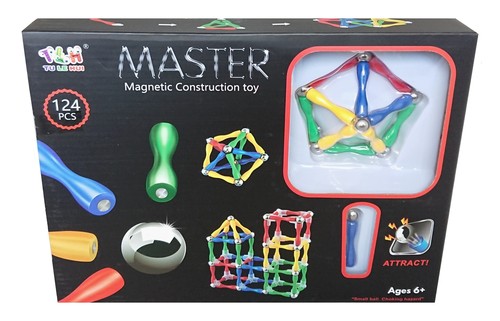 Zestaw magnetycznych klocków konstrukcyjnych Master 124 elementy: - 30 kilek - 4x16 patyczków w różnych kolorach - 30 trójkątnych łączników Dla dzieci w wieku od 6 lat
