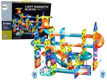 Świecąca Zjeżdżalnia Dla Kulek Klocki Magnetyczne 110 Elementów Świecąca zjeżdżalnia dla kulek to ekscytująca zabawka dla dzieci, która zapewni wiele godzin zabawy i rozrywki. Łączy ze sobą dwa rodzaje zabawek- klocki magnetyczne i zjeżdżalnię dla kulek. Zabawka ma funkcję edukacyjną. Pozwala na rozwijanie zdolności manualnych przy budowaniu toru, kreatywności oraz zachęca do eksperymentu i tworzenia coraz nowszy budowli i konstrukcji. Zjeżdżalnia składa się z kilku połączonych ze sobą elementów magnetycznych, po których zjeżdżają świecące kulki. Niektóre elementy toru posiadają w sobie diody LED, również małe reflektory, które można ustawić z boku toru, oświetlając go. Oświetlenie zapewnia jeszcze więcej zabawy i atrakcyjności. W zestawie znajduje się instrukcja, która pokazuje przykładowe konstrukcje. Zbuduj tor, gdzie znajdują się rampy, pętle i przeszkody, które dziecko może dowolnie łączyć i układać. Każdy klocek na końcu posiada magnesy lub zatrzaski, które przyciągają się i umożliwiają tworzenie trójwymiarowych konstrukcji, po których będzie mknęła mała świecąca kulka. W zestawie znajduje się 110 elementów. Elementy zestawu: - kuleczki świecące, elementy świecące - zwykłe kuleczki - klocki magnetyczne - naklejki - przykładowa instrukcja średnica kuleczek: 2,5 cm Wymiary opakowania: 36 cm x 28 cm x 9 cm Wszelkie elementy wchodzące w skład przedstawianej zabawki wykonane są z bezpiecznych dla dziecka, atestowanych materiałów. Zestaw ten posiada certyfikat CE, dlatego jest idealnym prezentem dla dzieci - zwłaszcza tych, które ukończyły 3 rok życia. Warto zwrócić na to uwagę, ponieważ w opakowaniu znajduje się wiele elementów o małym rozmiarze. Zawiera baterie 1,5 V LR1130 i LR41.