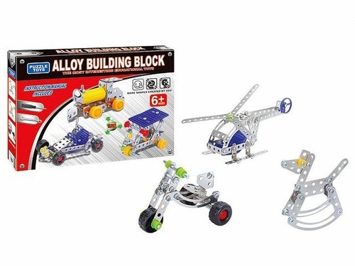 Zestaw metalowych klocków konstrukcyjnych umożliwiający zbudowanie trzech pojazdów. Zawiera 197 elementów. Dla dzieci w wieku od 6 lat.
