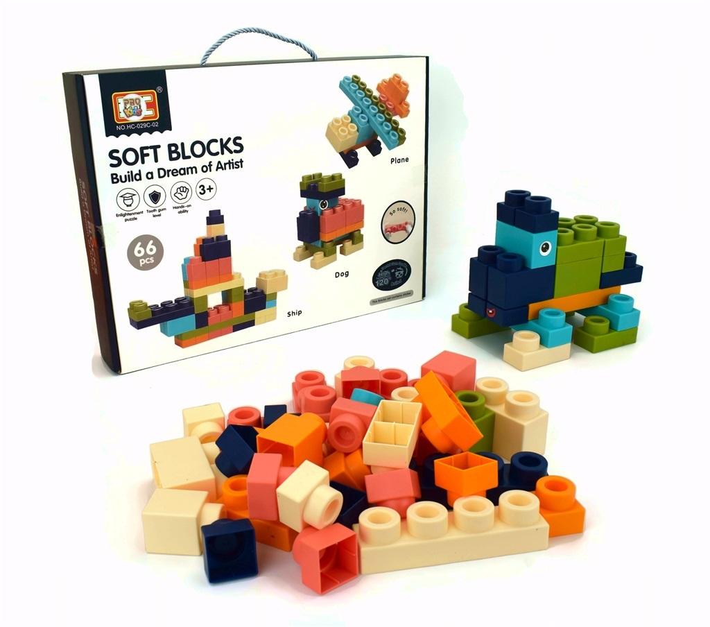 Miękkie klocki posiadają kształt, kolor i rozmiar idealnie dopasowane do możliwości motorycznych dzieci od 3 lat. Miękkie ścianki klocków są elastyczne, dzięki temu są bezpieczne dla dzieci. Klocki wspierają rozwój zmysłów i usprawnia procesy integracji sensorycznej, przez co dziecku łatwiej przychodzi nauka innych umiejętności. Zestaw zawiera naklejki z ustami i oczami, dzięki temu dziecko stworzy z klocków postacie lub zwierzęta.