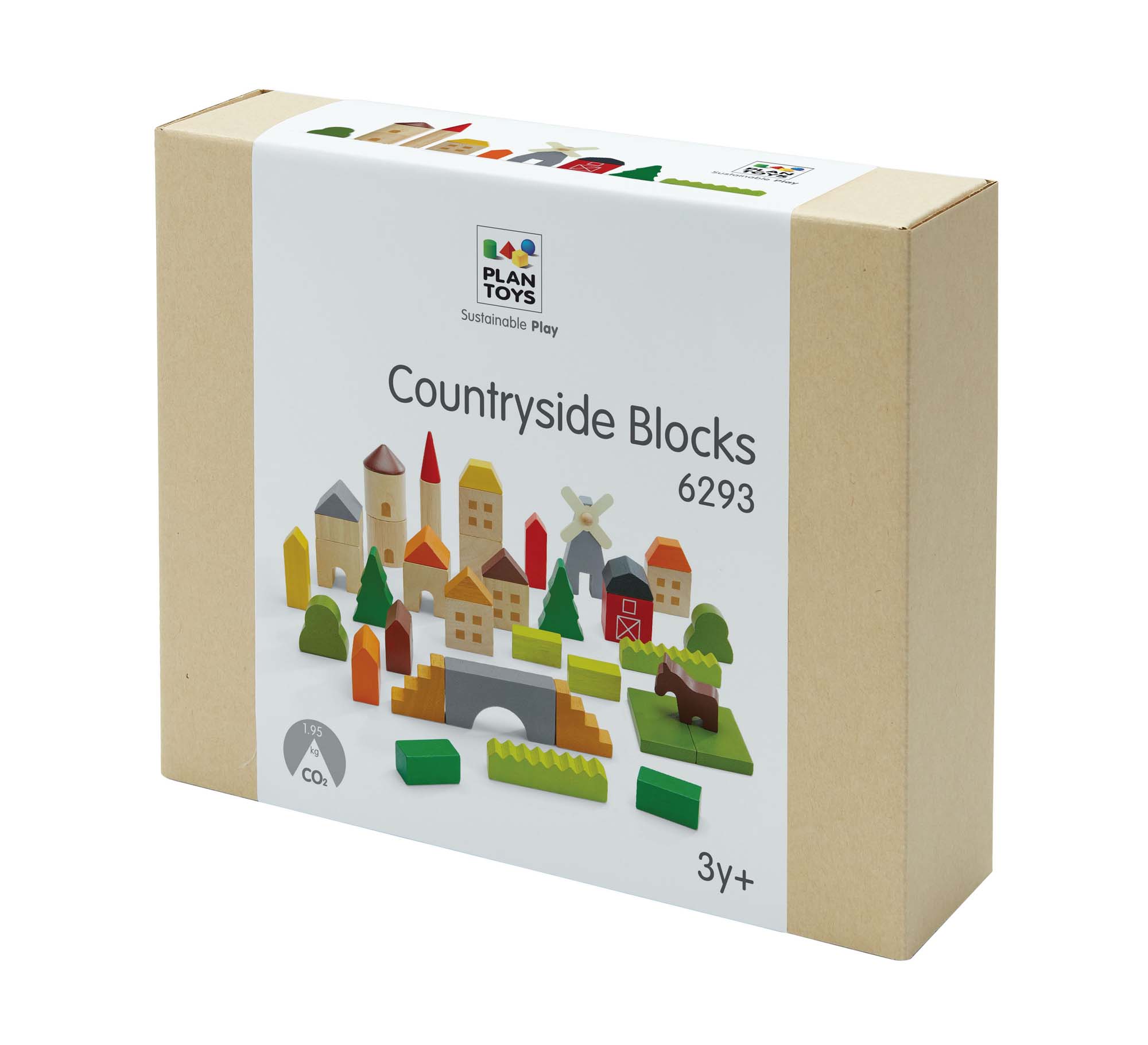 Urocze kolorowe klocki Plan Toys przedstawiają prawdziwą wieś, z młynem, konikiem, stodołą, mostem i domkami.