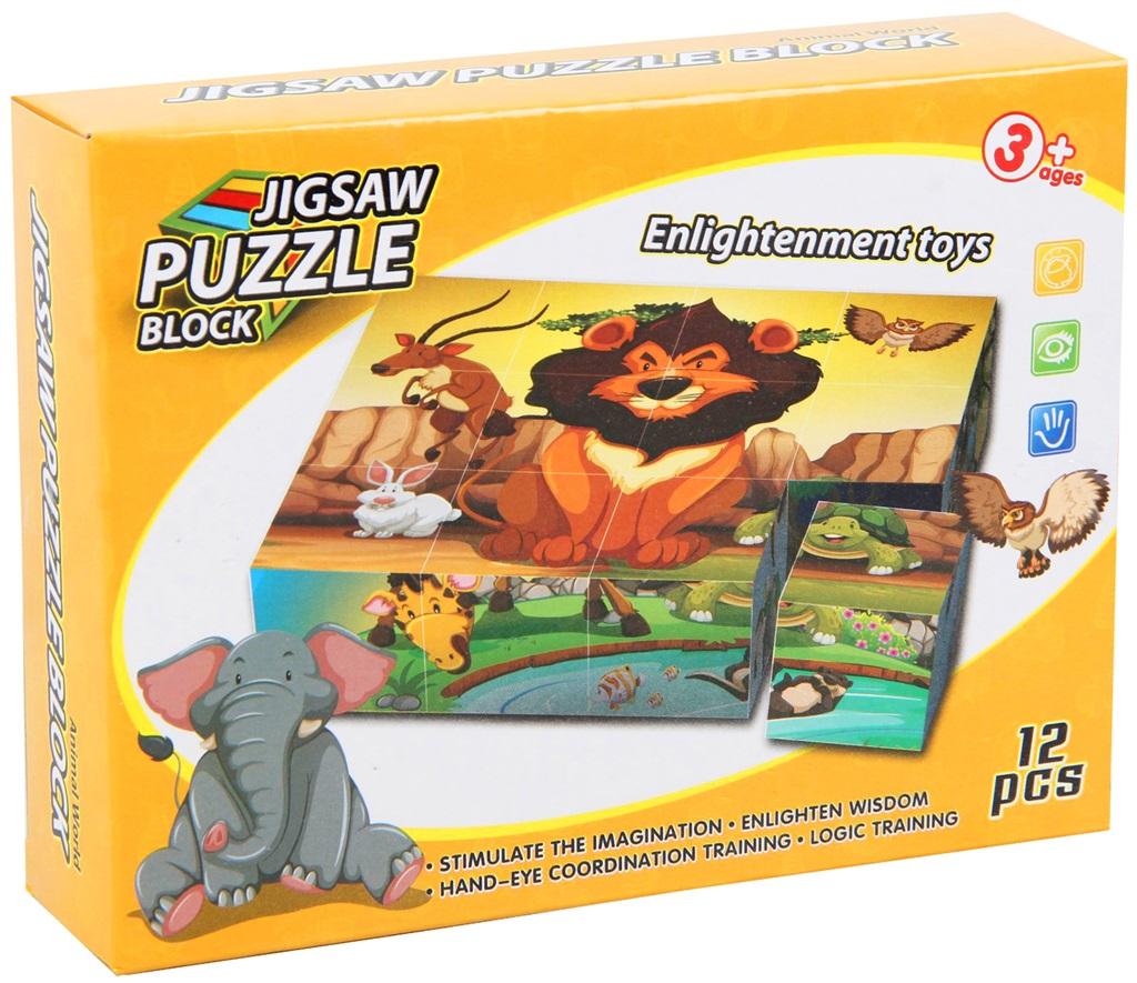 12 elementowy zestaw klocków z któych można ułożyć 6 różnych obrazków ze zwierzętami.