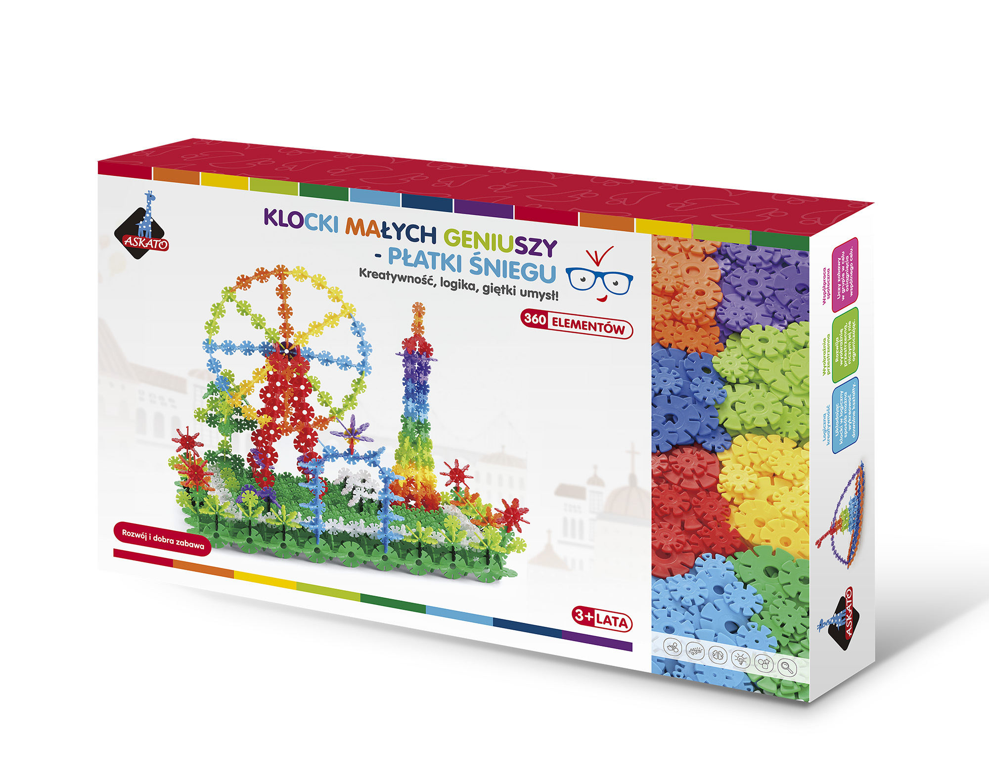 360 klocków w 10 kolorach pozwalają stworzyć fantastyczne, przestrzenne figury takich jak domek, kwiatek czy karuzela POLSKIE OPAKOWANIE
