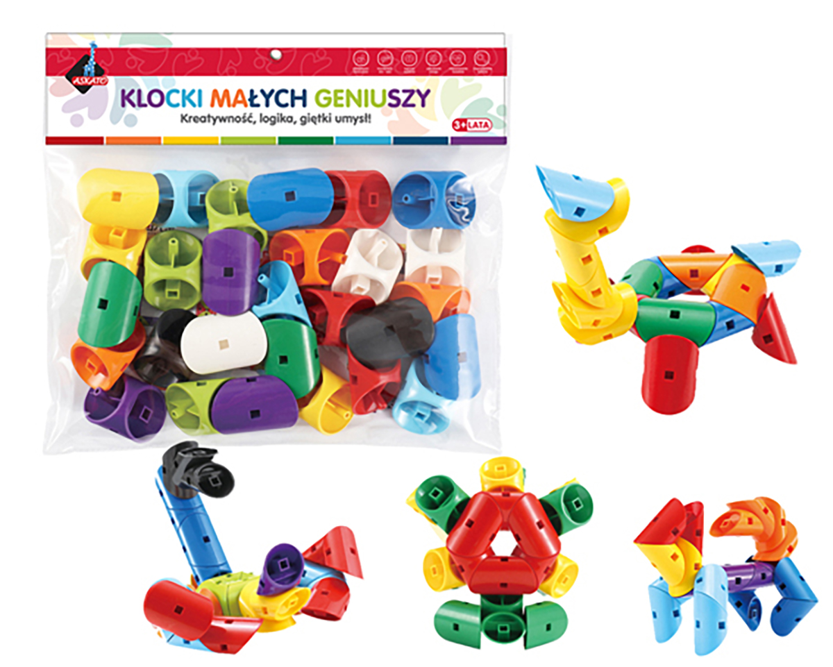 Edukacyjne klocki o unikatowej formie.Duży rozmiar klocka w 10 kolorach pozwala stoworzyć fantastyczne figury.Specjalna forma klocka pozwala połączyć go w wielu kombinacjach, dzięki czemu można tworzyć mnóstowo ciekawych i kolorowych przedmiotów.Zestaw zawiera 28 elementów w 10 kolorach.Wiek: 3+Wymiary opakowania: 31x5x27 cm