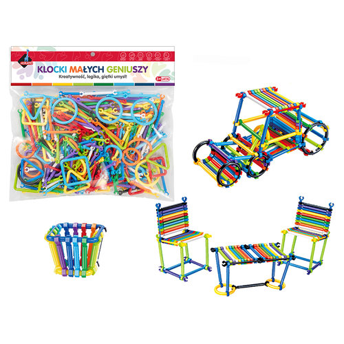 Aż 293 elementy w 10 kolorach pozwala stworzyć fantastyczne figury, zaczynając od tych prostych takich jak kosz, kula, huśtawka, poprzez nieco trudniejszy leżak plażowy, parasol czy czołg.