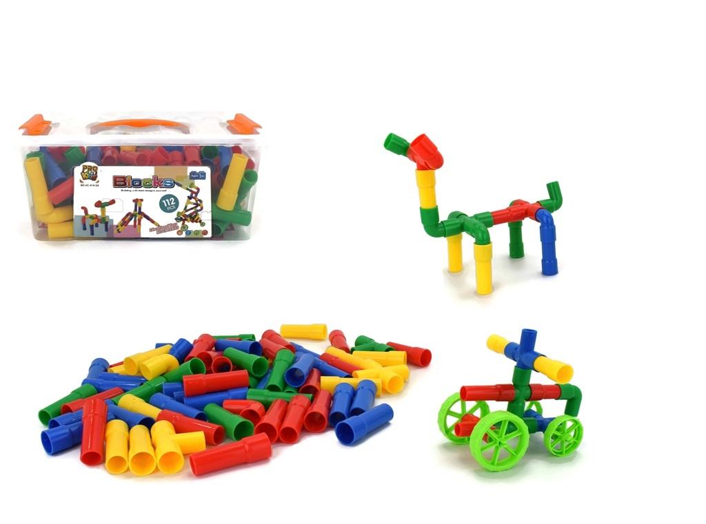 Klocki w kształcie rur to świetny sposób na kreatywną zabawę dla dziecka. Łączenie klocków jest łatwe, ale za to solidne, klocki samoczynnie nie rozłączą się. Kuferek ułatwia utrzymywanie porządku w pokoju, ponieważ po skończonej zabawie wystarczy wrzucić klocki do kuferka. Klocki rury doskonale nadają się do zabawy w wodzie. System rurek pozwala na przelewanie przez nich wody oraz budowanie systemu mini wodociągu. Dzięki temu dziecko poznaje zasady fizyki oraz pobudza wyobraźnię przestrzenną. W zestawie oprócz kolorowych rur w różnych kształtach, znajdują się również koła, które pozwolą zbudować pojazd.