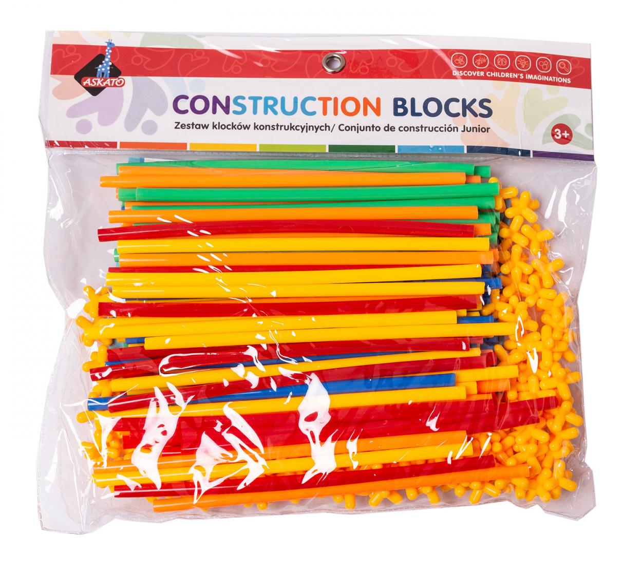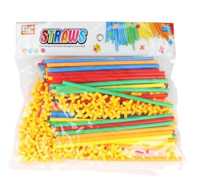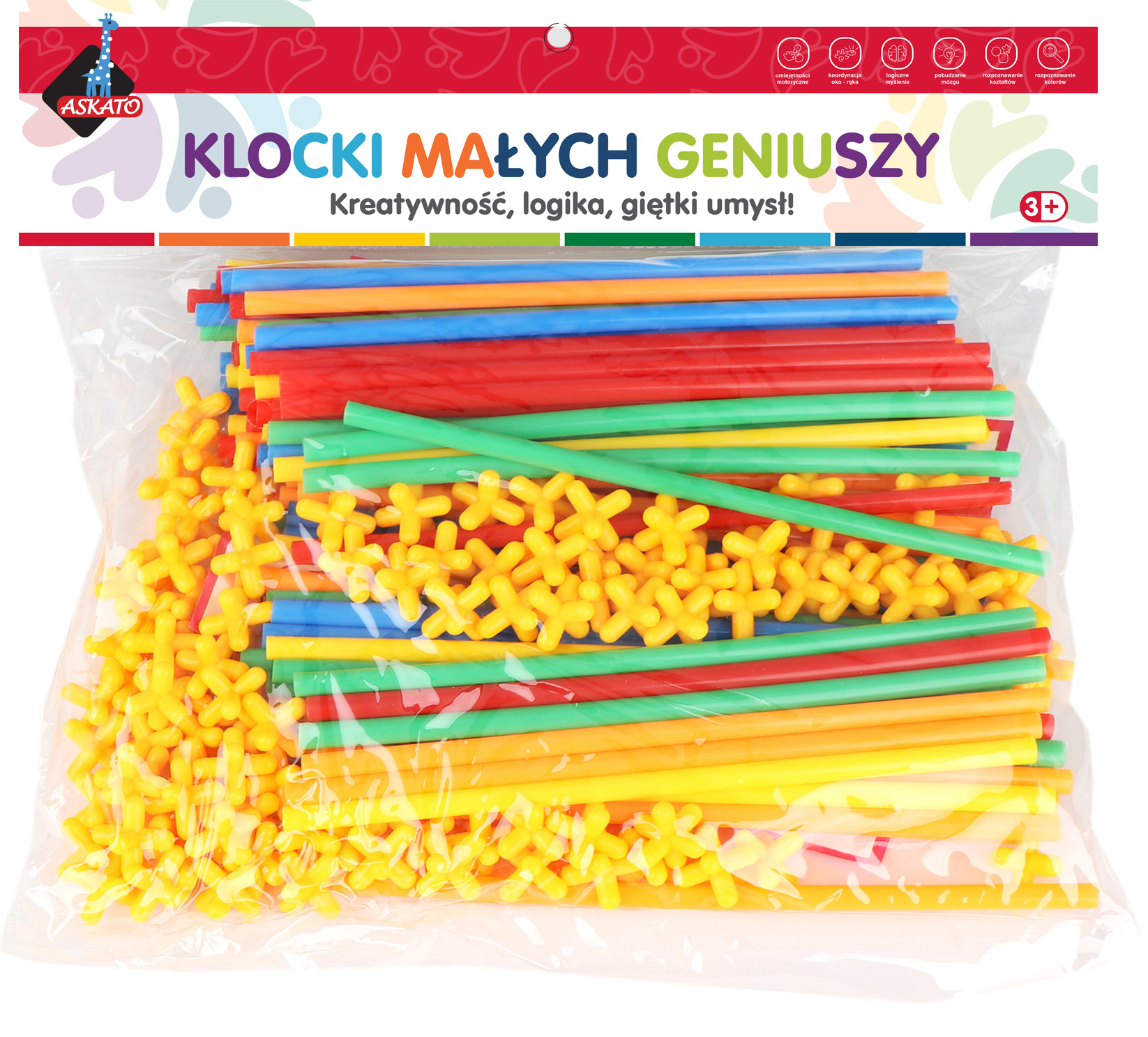 Klocki - patyczki, które za pomocą krzyżaków, można łączyć w różne figury. 200 elementów w różnych kolorach. Patyk-słomka o wymiarach 19x0.5 cm Wiek: 3+ Wymiary opakowania: 30x3x28 cm