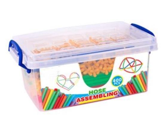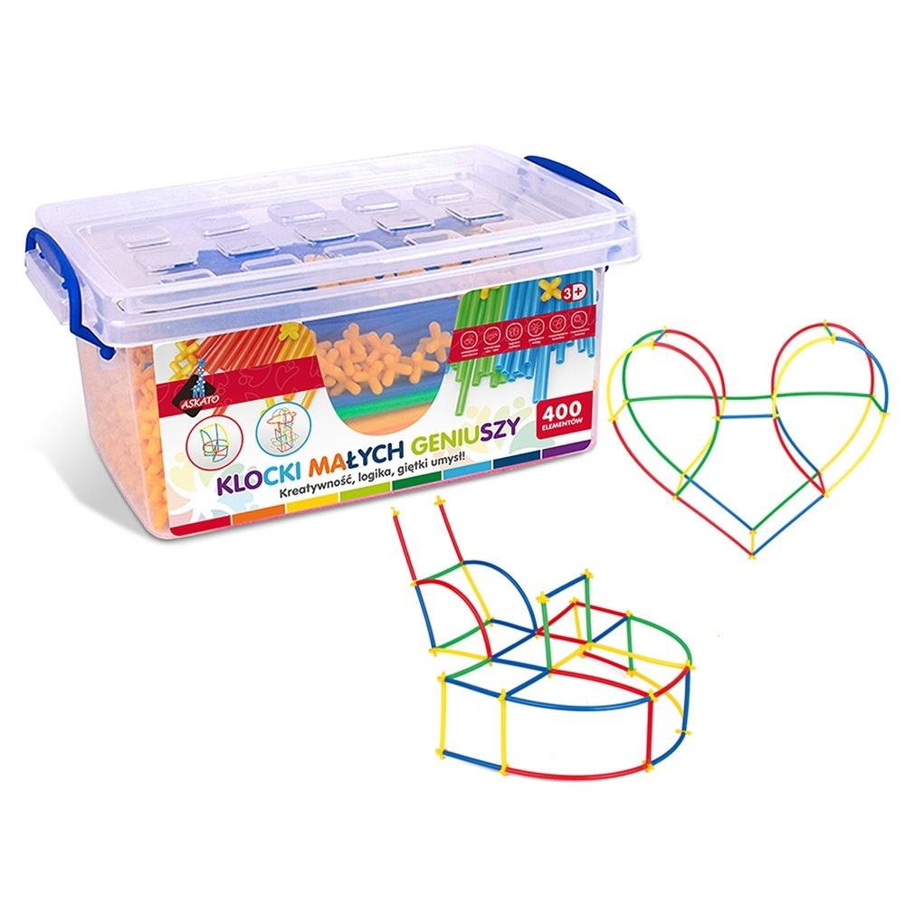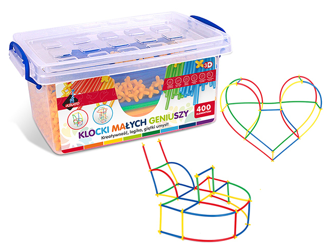 Klocki - patyczki, któe za pomocą krzyżaków, można łączyć w różne figury. 400 elementów w różnych kolorach. Patyk-słomka o wymiarach 19x0.5 cm