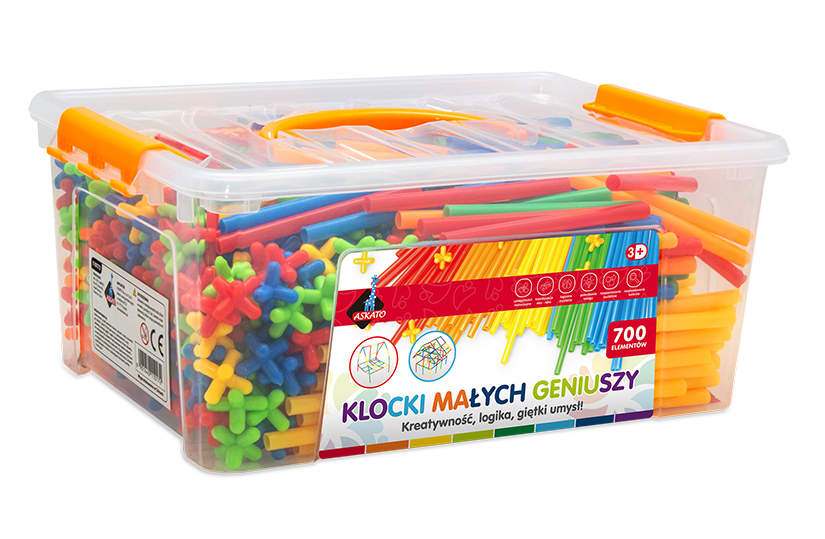 Klocki - patyczki, które za pomocą krzyżaków, można łączyć w różne figury. 700 elementów w różnych kolorach. Patyk-słomka o wymiarach 19x0.5 cm