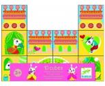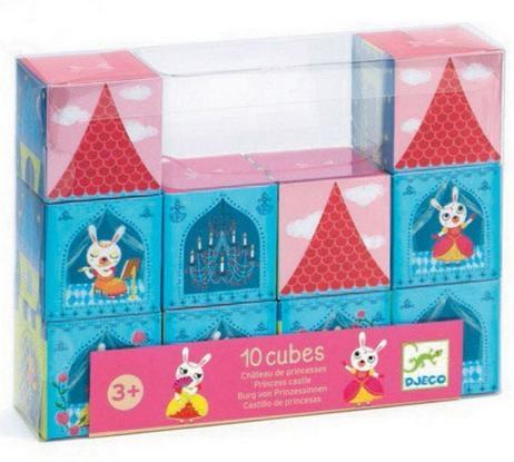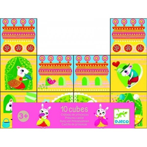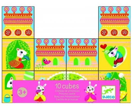 Tekturowe klocki (sześciany), z których układa się zamki księżniczek. W zestawie 10 klocków. Do ułożenia 4 zamki. Walory edukacyjne: ćwiczenie koordynacji oko-ręka, małą motorykę dłoni, spostrzegawczość, wyobraźnię. Wielkość kostki : 6 x 6 x 6 cm. Wiek dziecka: 3+