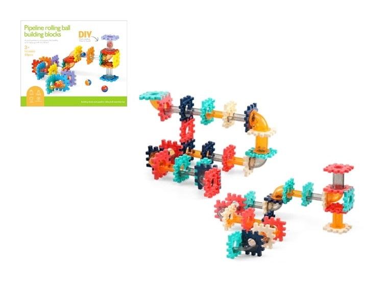 Kolorowe klocki z kolorowymi piłeczkami i tunelem dla urozmaicenia budowy. Produkt składa się z 49 klocków. Produkt zapakowany w kartonowe opakowanie. Podane wymiary są wymiarami opakowania. Produkt dla dzieci od 3 lat.
