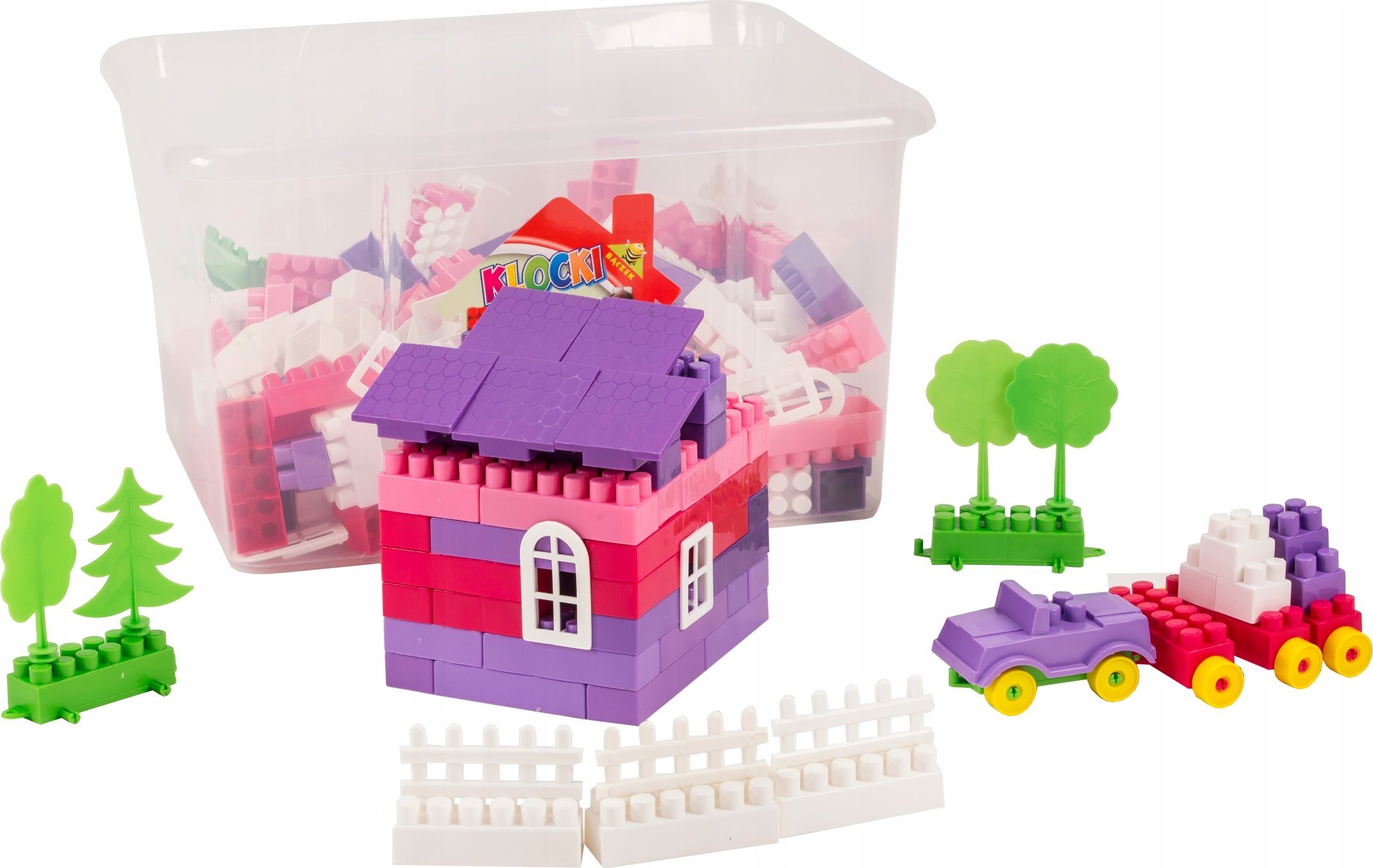 Średni zestaw klocków w pojemniku składający się z 345 el.. Zestaw w kolorystyce dziewczęcej. Oprócz klocków w zestawie znajdują się również takie akcesoria jak: znaki drogowe, drzewka, samochodziki, daszki itp.