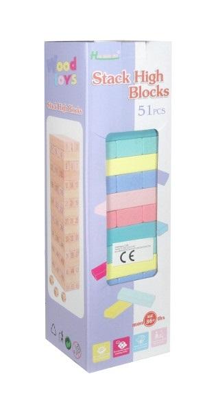 Drewniane klocki do układania w pastelowych kolorach które są także grą zręcznościową. Uważaj żebyś nie zburzył budowli. Zabawka przeznaczona dla dzieci powyżej 3 roku życia. Produkt zapakowany w kartonowe pudełko z przezroczystym okienkiem.