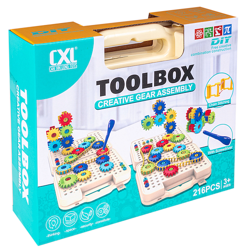 Zapakowane w plastikową walizkę, która po rozłożeniu służy jako podstawa do przykręcania kolorowych, zębatych kółek.