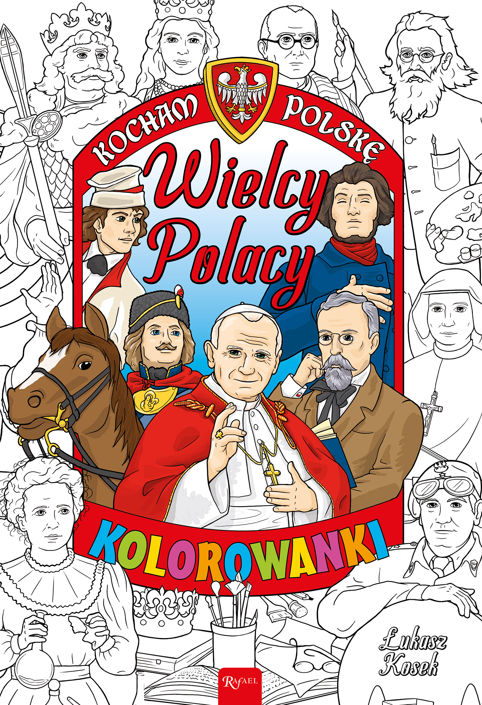 Tym razem w serii przygotowaliśmy KOLOROWANKI prezentujące sylwetki wielkich Polaków, patriotów i bohaterów. Ilustracje zachowują dziecięce wyobrażenia o nich, a jednocześnie zawierają wiele wiadomości o każdej z postaci, prezentując rozpoznawalne atrybuty, detale charakterystyczne dla epoki, pełnionych funkcji i osiągnięć.