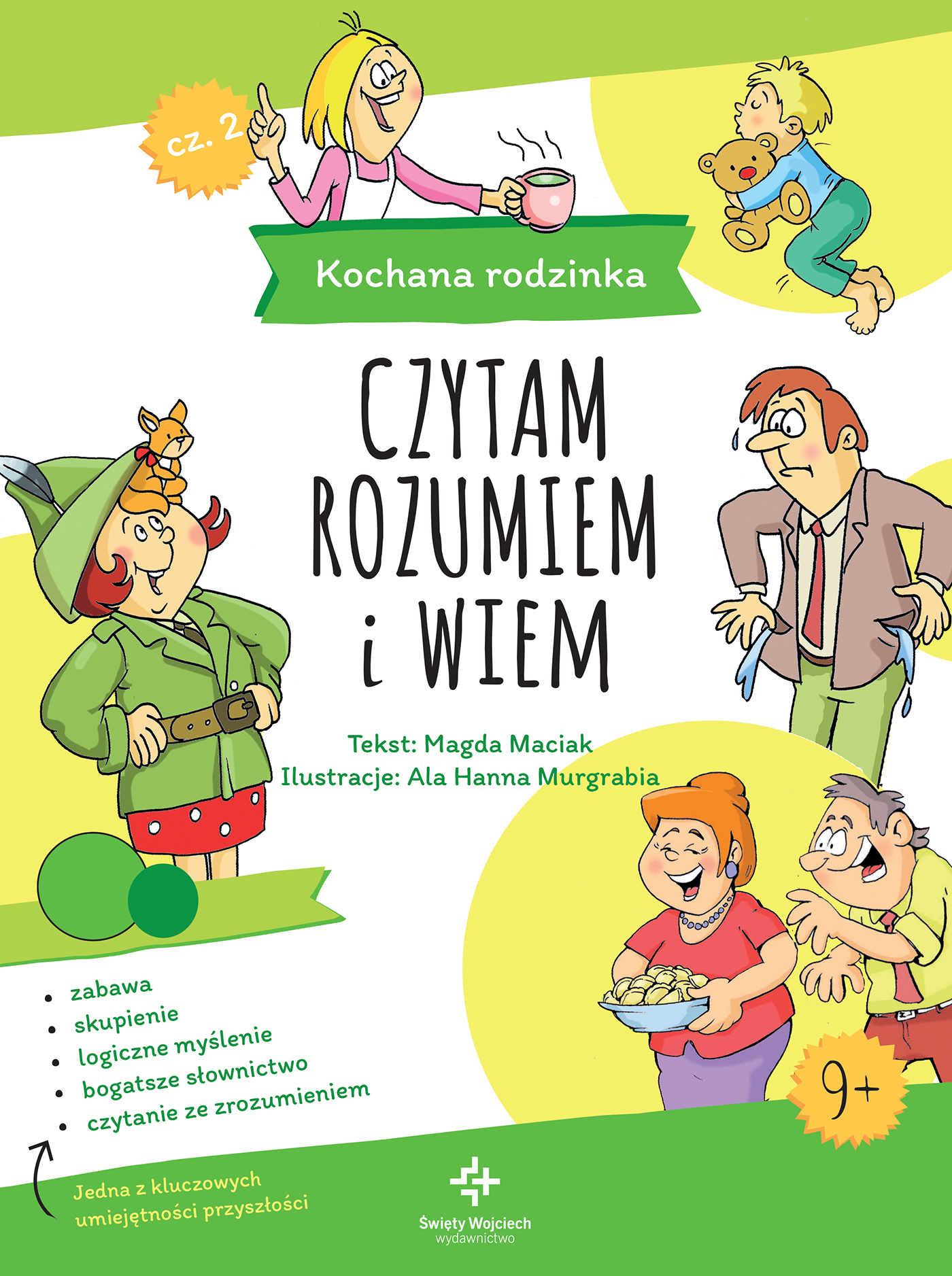 Seria edukacyjnych książeczek dla dzieci potrafiących samodzielnie czytać. Każda zawiera opowiadania + zadania do wykonania + kolorowanki. Rozwijają jedną z kluczowych umiejętności – czytanie ze zrozumieniem. Dlaczego warto kupić te publikacje? • poczucie humoru (zabawne teksty i ilustracje) • połączenie grafiki z tekstem (zaangażowanie wielu zmysłów) • dopasowanie stopnia trudności do wieku czytelnika (oznaczenia stopni trudności) • podejmowanie tematów bliskich życiu dziecka (niekreskówkowa rzeczywistość) • niewielka objętość tekstów (nie zniechęci nawet tych, którzy z trudnością otwierają książki) • wolność wyboru (można ją czytać od deski do deski lub wybierać kolejność opowiadań) Korzyści dla dziecka: • kształcenie umiejętności czytania ze zrozumieniem • ćwiczenie koncentracji • poszerzanie zasobu słownictwa • poznanie i umiejętność stosowania związków frazeologicznych • pomoc przy zdawaniu testów O autorce: Magda Maciak - polonistka, dziennikarka, wieloletnia redaktor pism „Kumpel” i „Victor”. Autorka wielu scenariuszy komiksów, artykułów, zabaw i książek edukacyjnych. Organizatorka konkursów i akcji promujących czytanie oraz warsztatów dziennikarskich. Entuzjastka dobrej edukacji. Kocha dzieci, zwierzaki i góry. Patroni medialni: TVP ABC, Miastodzieci.pl, Radio Emaus, Międzynarodowa Kapituła Orderu Uśmiechu, Instytut Praw Dziecka im. Janusz Korczaka, Międzynarodowe Stowarzyszenie im. J. Korczaka