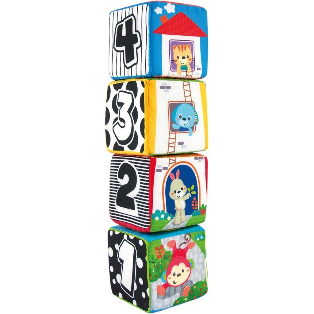 Wibrująca kostka i bezpieczne lusterko. Kolorowe rysunki, cyfry, figury geometryczne oraz ruchome elementy. Pociągnij za kość, a pies zacznie wiercić się i ruszać. W lusterku zobacz swoje odbicie i zrób śmieszną minę. Uczymy języka. Nazywanie obrazków, kształtów, cyfr wzbogaca słownictwo. Sortowanie i budowanie rozwija inteligencję. Ułóż kostki zgodnie z kategoriami (figury geometryczne, cyfry, zwierzęta, domek, podwórko). Sortowanie i segregowanie rozwija inteligencję dziecka. Zabawa w nakładanie i budowanie rozwija orientację przestrzenną i małą motorykę.