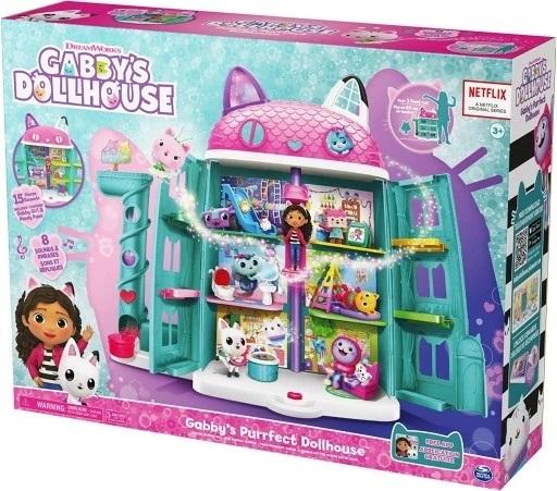 Pobaw się we własnym świecie domków dla lalek z kocim domkiem Gabi Purrfect Dollhouse! Ten fantastyczny, wysoki na ponad 2 stopy domek dla dzieci jest pełen ekscytujących funkcji do odkrycia, w tym wieżyczka dla kotków, działający Cat-A-Vator, dźwięki i wiele więcej! Z 8,9-centymetrową figurką Gabi, figurką Kiciusia Pandusia, meblami do każdego pokoju, trzema akcesoriami i z dwoma przesyłkami do kociego domku, możesz przejść do zabawy zaraz po wyjęciu z pudełka. Tak jak w serialu, wrzuć przesyłkę do wieży i naciśnij przycisk, aby ją odzyskać - rozpakuj ją, aby znaleźć w środku akcesoria-niespodzianki! Otwórz koci domek i naciśnij przycisk z przodu, aby usłyszeć piosenki, dźwięki i zwroty z serialu! Mając tyle pokoi i niespodzianek do odkrycia, użyj swojej wyobraźni, aby rozegrać niekończące się przygody z Gabi i jej najlepszym kumplem Kiciusiem Pandusiem. Zrelaksuj się na kolorowej kanapie w pokoju muzycznym i otwórz drzwi na drzewie, aby odsłonić gościa na tle pokoju. Jesteś głodny? Odwróć stół w kuchni, aby zmienić go ze śniadaniowego w obiadowy! Przejedź się w Cat-A-Vator i przesuń go w górę, aby dotrzeć na każde piętro. Pomóż Gabi umyć ręce przy umywalce w łazience lub znajdź kolorową niespodziankę w toalecie; pozwól Kiciusowi Pandusiowi odpocząć pod namiotem w sypialni; wykaż się kreatywnością na sztalugach w pokoju do majsterkowania i baw się na zjeżdżalni w pokoju zabaw. Gdy dotrzesz na ostatnie piętro, odwróć dach i baw się na strychu! Dodaj więcej pokoi do swojego zabawkowego domku dzięki Pokojom Deluxe (każdy sprzedawany osobno) - wsuń pokoje bezpośrednio w ściany kociego domku! Dla łatwego przechowywania po całym dniu udawanej zabawy, Gabby's Purrfect Dollhouse można zamknąć z lub bez pokoi Deluxe w środku. Ten koci domek to doskonały prezent dla dzieci w wieku od 3 lat. Dodatkowa niespodzianka: zeskanuj kod QR wewnątrz przesyłki do kociego domku, aby odblokować specjalną nagrodę w darmowej aplikacji Gabby's Dollhouse App (dostępnej na iOS i Android). Wprowadź magię domku dla kotków Gabi dzięki Gabby's Purrfect Dollhouse!