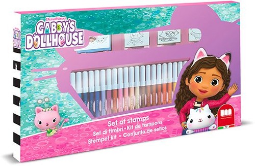 Pieczątki na licencji Koci Domek Gabi. W skład zestawu wchodzą: 3 drewniano-gumowe pieczątki, 1 poduszeczka do tuszu, 36 pisaków oraz książeczka z aktywnościami. Wiek 3+