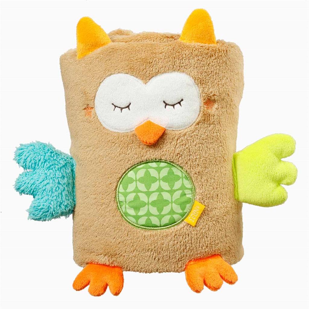 Delikatny w dotyku kocyk, śpiąca Sowa, z uszkami i skrzydełkami, do chwytania i tarmoszenia, będzie pełnił rolę najlepszego przyjaciela, pocieszyciela, bratniej duszy i opiekuna. Możne służyć jako przytulanka lub poduszeczka. Można go używać do owinięcia w wózku lub foteliku dziecięcym, jako podkładka do raczkowania, wkładka do kojca lub jako okrycie w łóżeczku. Twoje dziecko będzie czuć się komfortowo i bezpiecznie. Wykonany z najwyższej jakości materiału, dzięki dodatkowej zawleczce daje się złożyć w zgrabny pakunek, dzięki temu może być doskonałym towarzyszem w domu lub w podróży.