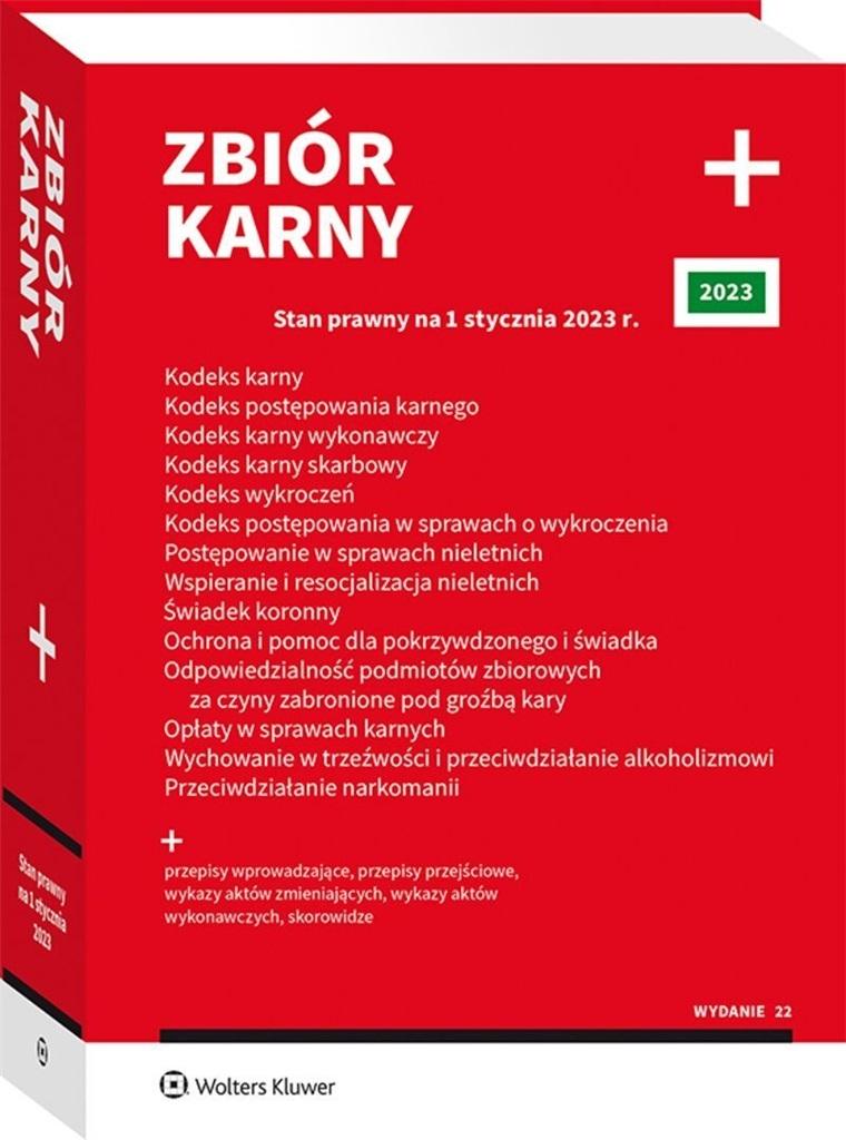 Stan prawny: 1 stycznia 2023 r. Zbiór uwzględnia zmiany związane z dużą reformą kodeksu karnego! Zmiany, które weszły w życie między 12 sierpnia 2022 r. a 1 stycznia 2023 r., oznaczono tekstem pogrubionym, natomiast wszystkie zmiany, które wejdą w życie po 1 stycznia 2023 r., oznaczono tekstem pogrubionym i mniejszym stopniem pisma. Najważniejsze uwzględnione zmiany: – ustawa z 7 lipca 2022 r. o zmianie ustawy – Kodeks karny oraz niektórych innych ustaw (Dz.U. poz. 2600) – ustawa z 5 sierpnia 2022 r. o zmianie ustawy – Kodeks karny wykonawczy oraz niektórych innych ustaw (Dz.U. poz. 1855) – ustawa z 6 października 2022 r. o zmianie ustaw w celu przeciwdziałania lichwie (Dz.U. poz. 2339) zmiany: – ustawa z 7 lipca 2022 r. o zmianie ustawy – Kodeks karny oraz niektórych innych ustaw (Dz.U. poz. 2600) – ustawa z 5 sierpnia 2022 r. o zmianie ustawy – Kodeks karny wykonawczy oraz niektórych innych ustaw (Dz.U. poz. 1855) – ustawa z 6 października 2022 r. o zmianie ustaw w celu przeciwdziałania lichwie (Dz.U. poz. 2339) Oddawany do rąk Czytelników zbiór przepisów obejmuje: K.K., K.P.K., K.K.W., K.K.S., K.W., K.P.W., U.W.R.N., U.Ś.K., U.O.P.P.Ś. oraz U.O.P.Z., U.O.K., U.W.T.P.A., U.P.N. K.K. – uwzględniono zmiany dotyczące m.in. modyfikacji katalogu kar oraz zaostrzenia odpowiedzialności karnej za najpoważniejsze przestępstwa przeciwko życiu, zdrowiu i wolności seksualnej, w szczególności na szkodę małoletnich, za przestępstwa drogowe popełniane w stanie nietrzeźwości lub pod wpływem środka odurzającego, a także przestępstwa popełniane w ramach zorganizowanych grup przestępczych. K.P.K. – uwzględniono m.in. nowe przepisy związane z Prokuraturą Europejską; przewidujące wprowadzenie właściwości rzeczowej sądu okręgowego dla typów kradzieży z włamaniem lub kradzieży szczególnie zuchwałej; zmieniające regulacje poręczenia majątkowego, zabezpieczenia pojazdu mechanicznego na poczet jego przepadku oraz jego tymczasowego zajęcia; zaskarżania wydawanych w postępowaniu odwoławczym postanowień o zastosowaniu tymczasowego aresztowania. K.K.W. – uwzględniono m.in. zmiany dotyczące elektronicznej kontroli miejsca pobytu w związku z udzieloną przerwą w wykonaniu kary pozbawienia wolności. K.K.S. – uwzględniono m.in. zmiany dotyczące przestępstw skarbowych, do których mają zastosowanie przepisy Kodeksu karnego, oraz kary łącznej. K.W. – rozszerzono katalog przedmiotów wykonawczych wykroczenia z art. 65a; podwyższono górną granicę kary grzywny za czyn polegający na złośliwym wprowadzeniu w błąd lub w inny sposób złośliwym niepokojeniu innej osoby; zmieniono przepisy typizujące wykroczenia za zakłócanie przebiegu zdalnej komunikacji prowadzonej za pomocą systemów teleinformatycznych i za nieprzestrzeganie zakazów, nakazów, ograniczeń lub obowiązków wynikających z przepisów o zapobieganiu oraz zwalczaniu zakażeń i chorób zakaźnych lub z decyzji wydanych na podstawie tych przepisów. U.W.T.P.A. – uwzględniono m.in. zmiany dotyczące wprowadzenia postępowania uproszczonego w procedurze udzielenia zezwolenia na obrót hurtowy w kraju napojami alkoholowymi o zawartości powyżej 18% alkoholu oraz zezwolenia na obrót hurtowy w kraju napojami alkoholowymi o zawartości do 18% alkoholu. U.P.N. – zmiany dotyczą zaostrzenia górnych granic kar m.in. za wytwarzanie, przetwarzanie, przerabianie środków odurzających, substancji psychotropowych lub nowych substancji psychoaktywnych albo przetwarzanie słomy makowej w znacznych ilościach. Na początku zbioru zamieszczono spis wszystkich aktów prawnych wprowadzających te zmiany wraz z informacją, których przepisów dotyczą. Skorowidze do ustaw oraz tytuliki towarzyszące poszczególnym artykułom ustaw znacznie ułatwiają korzystanie ze zbioru. Publikację uzupełniono o wykazy wszystkich aktów zmieniających uwzględnione ustawy oraz wykazy aktów wykonawczych, a także wyciągi zawierające najważniejsze przepisy intertemporalne.