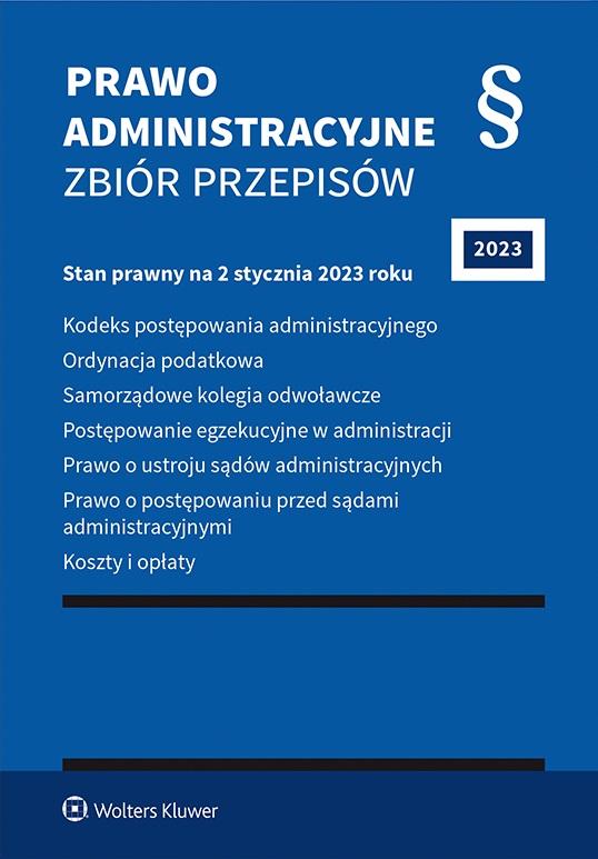 Zbiór obejmuje zmiany opublikowane do dnia 2 stycznia 2023 r., w tym m.in.: Kodeks postępowania administracyjnego: • ustawa z 5 sierpnia 2022 r. o zmianie ustawy – Kodeks karny wykonawczy oraz niektórych innych ustaw (poz. 1855) Ordynacja podatkowa: • ustawa z 7 października 2022 r. o zmianie ustawy o podatku dochodowym od osób prawnych oraz niektórych innych ustaw (Dz.U. poz. 2180) • ustawa z 29 października 2021 r. o zmianie ustawy o podatku dochodowym od osób fizycznych, ustawy o podatku dochodowym od osób prawnych oraz niektórych innych ustaw (Dz.U. poz. 2105) • ustawa z 1 grudnia 2022 r. o zmianie ustawy o podatku akcyzowym oraz niektórych innych ustaw (Dz.U. poz. 2707) Postępowanie egzekucyjne w administracji: • ustawa z 7 października 2022 r. o szczególnych rozwiązaniach służących ochronie odbiorców energii elektrycznej w 2023 roku w związku z sytuacją na rynku energii elektrycznej (Dz.U. poz. 2127) • ustawa z 7 października 2022 r. o zmianie ustawy o podatku dochodowym od osób prawnych oraz niektórych innych ustaw (Dz.U. poz. 2180) • ustawa z 1 grudnia 2022 r. o zmianie ustawy o rozpatrywaniu reklamacji przez podmioty rynku finansowego i o Rzeczniku Finansowym oraz niektórych innych ustaw (Dz.U. poz. 2640) Postępowanie przed sądami administracyjnymi: • ustawa z 5 sierpnia 2022 r. o zmianie ustawy - Kodeks karny wykonawczy oraz niektórych innych ustaw (Dz.U. poz. 1855)