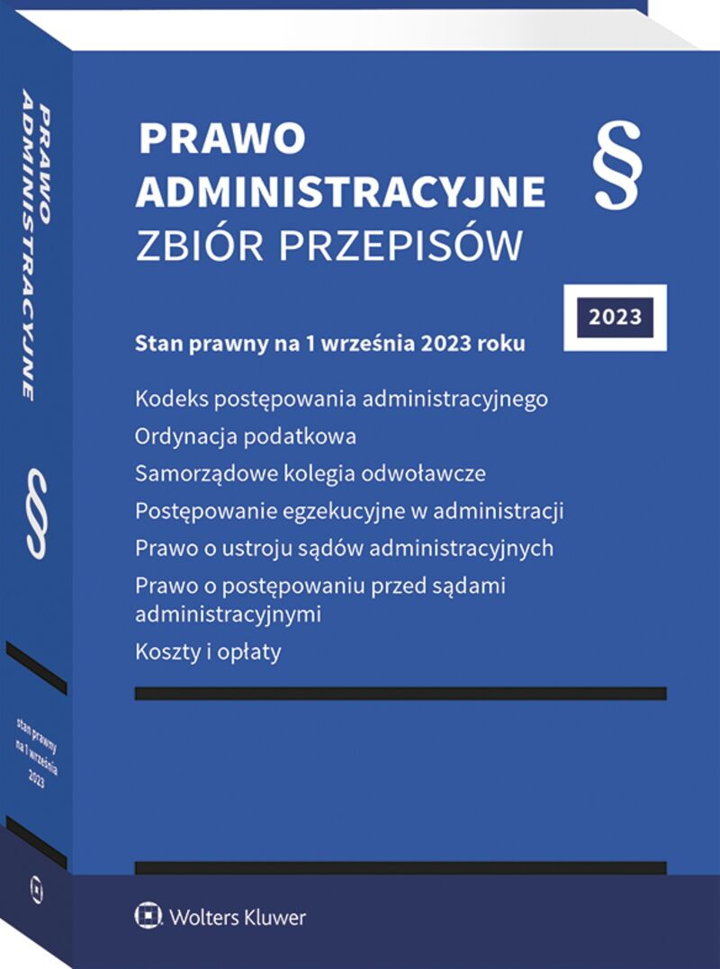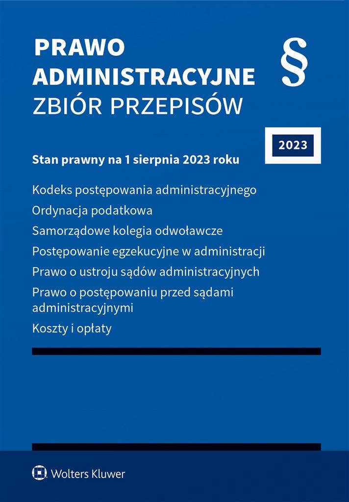 Stan prawny: 1 sierpnia 2023 roku Publikacja uwzględnia zmiany wchodzące w życie z dniem: KODEKS POSTĘPOWANIA ADMINISTRACYJNEGO: 25 kwietnia 2023 r. – obwieszczenie Marszałka Sejmu Rzeczypospolitej Polskiej z 17 kwietnia 2023 r. w sprawie ogłoszenia jednolitego tekstu ustawy - Kodeks postępowania administracyjnego (Dz.U. poz. 775) 12 maja 2023 r. – ustawa z 26 stycznia 2023 r. o zmianie ustaw w celu likwidowania zbędnych barier administracyjnych i prawnych (Dz.U. poz. 803) ORDYNACJA PODATKOWA: 10 lutego 2023 r. – ustawa z 1 grudnia 2022 r. o Systemie Informacji Finansowej (Dz.U. poz. 2180) 1 marca 2023 r., 1 lipca 2023 r. – ustawa z 7 października 2022 r. o zmianie ustawy o podatku dochodowym od osób prawnych oraz niektórych innych ustaw (Dz.U. z 2023 r. poz. 180) 1 kwietnia 2023 r. – ustawa z 9 marca 2023 r. o zmianie ustawy o dostępności cyfrowej stron internetowych i aplikacji mobilnych podmiotów publicznych oraz ustawy – Ordynacja podatkowa (Dz.U. poz. 511) 22 maja 2023 r. – ustawa z 26 stycznia 2023 r. o fundacji rodzinnej (Dz.U. poz. 326) 1 lipca 2023 r., 25 marca 2024 r. – ustawa z 9 marca 2023 r. o zmianie ustawy o postępowaniu egzekucyjnym w administracji oraz niektórych innych ustaw (Dz.U. poz. 556) 1 lipca 2023 r. – ustawa z 9 marca 2023 r. o zmianie ustawy – Kodeks postępowania cywilnego oraz niektórych innych ustaw (Dz.U. poz. 614) 1 lipca 2023 r., 1 września 2023 r. – ustawa z 26 maja 2023 r. o zmianie ustawy o podatku od towarów i usług oraz niektórych innych ustaw (Dz.U. poz. 1059) 1 lipca 2023 r. – ustawa z 26 maja 2023 r. o zmianie ustawy o autostradach płatnych oraz o Krajowym Funduszu Drogowym oraz niektórych innych ustaw (Dz.U. poz. 1193) 1 stycznia 2024 r. – ustawa z 29 października 2021 r. o zmianie ustawy o podatku dochodowym od osób fizycznych, ustawy o podatku dochodowym od osób prawnych oraz niektórych innych ustaw (Dz.U. poz. 2105) POSTĘPOWANIE EGZEKUCYJNE W ADMINISTRACJI: 25 marca 2023 r., 25 czerwca 2023 r., 25 marca 2024 r. – ustawa z 9 marca 2023 r. o zmianie ustawy o postępowaniu egzekucyjnym w administracji oraz niektórych innych ustaw (Dz.U. poz. 556) 20 maja 2023 r. – ustawa z 9 marca 2023 r. o zmianie ustawy o ochronie konkurencji i konsumentów oraz niektórych innych ustaw (Dz.U. poz. 852) 1 lipca 2023 r. – ustawa z 9 marca 2023 r. o zmianie ustawy – Kodeks postępowania cywilnego oraz niektórych innych ustaw (Dz.U. poz. 614) 1 lipca 2023 r. – ustawa z 26 maja 2023 r. o zmianie ustawy o podatku od towarów i usług oraz niektórych innych ustaw (Dz.U. poz. 1059) 1 lipca 2023 r. – ustawa z 9 maja 2023 r. o Funduszu Ochrony Rolnictwa (Dz.U. poz. 1130) 1 lipca 2023 r. – ustawa z 26 maja 2023 r. o zmianie ustawy o autostradach płatnych oraz o Krajowym Funduszu Drogowym oraz niektórych innych ustaw (Dz.U. poz. 1193) 1 października 2023 r. – ustawa z 7 lipca 2022 r. o zmianie ustawy – Kodeks karny oraz niektórych innych ustaw (Dz.U. poz. 2600) PRAWO O USTROJU SĄDÓW ADMINISTRACYJNYCH: PRAWO O POSTĘPOWANIU PRZED SĄDAMI ADMINISTRACYJNYMI: 8 lutego 2023 r. – obwieszczenie Marszałka Sejmu Rzeczypospolitej Polskiej z 27 stycznia 2023 r. w sprawie ogłoszenia jednolitego tekstu ustawy – Prawo o ustroju sądów administracyjnych (Dz.U. poz. 259) 12 maja 2023 r. – ustawa z 26 stycznia 2023 r. o zmianie ustaw w celu likwidowania zbędnych barier administracyjnych i prawnych (Dz.U. poz. 803) 1 października 2029 r. – ustawa z 18 listopada 2020 r. o doręczeniach elektronicznych (Dz.U. z 2023 r. poz. 285 ze zm.)