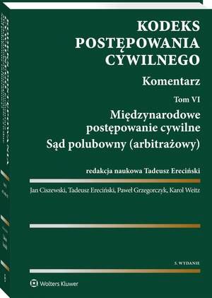 Oddajemy do rąk Czytelników kolejne wydanie dużego komentarza do kodeksu postępowania cywilnego. Autorstwo najwybitniejszych autorytetów polskiego prawa procesowego cywilnego oraz długoletnia obecność dzieła na rynku wydawniczym gwarantują najwyższy poziom merytoryczny i edytorski publikacji. W piątym wydaniu komentarz został podzielony na sześć tomów: - tomy I-III obejmują komentarz do części pierwszej kodeksu - postępowania rozpoznawczego, - w tomie IV omówiono postępowanie rozpoznawcze (nieprocesowe) części pierwszej i postępowanie zabezpieczające (część druga), - w tomie V - postępowanie egzekucyjne (część trzecia), - a w tomie VI - przepisy z zakresu międzynarodowego postępowania cywilnego (część czwarta) oraz dotyczące sądu polubownego (arbitrażowego) (część piąta). W tomie VI uwzględniono nowelizacje wprowadzone w latach 2013-2016, w tym również wchodzące w życie 10 stycznia 2017 r., dotyczące w szczególności zapisu na sąd polubowny obejmujący spory wynikające z umów, których stroną jest konsument. Omówiono również zmiany w zakresie określenia jurysdykcji krajowej dla spraw z powództwa pracownika delegowanego na terytorium Polski przez pracodawcę mającego siedzibę w państwie będącym członkiem Unii Europejskiej; dotyczące uznania lub stwierdzenia wykonalności orzeczenia, ugody lub innego tytułu egzekucyjnego za granicą, a także wprowadzenia regulacji europejskiego poświadczenia spadkowego. Szczegółowo omówiono księgę czwartą zawierającą przepisy rozporządzenia Parlamentu Europejskiego i Rady (UE) nr 1215/2012 i nr 606/2013, w których wprowadzony został system tzw. automatycznej wykonalności w odniesieniu do objętych nimi orzeczeń sądowych i innych tytułów.