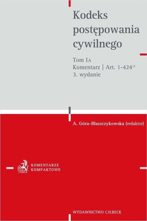 Tom IA. Komentarz do art. 1-424(12) KPC oraz Tom IB. Komentarz do art. 425–729 KPC pod redakcją prof. Agnieszki Góry-Błaszczykowskiej to szczegółowe opracowanie przepisów regulujących całe postępowanie rozpoznawcze w KPC. Komentarz do art. 1–424(12) KPC omawia szczegółowo zagadnienia dotyczące m.in.: przepisów ogólnych dotyczących postępowania cywilnego, właściwości sądu, wyłączenia sędziego, stron w postępowaniu sądowym, kosztów procesowych, terminów, dowodów, środków odwoławczych, skargi kasacyjnej, wznowienia postępowania, a także związane z tymi zagadnieniami nowe poglądy doktryny oraz orzecznictwo sądów powszechnych, SN i TK. Autorzy, wykorzystując wieloletnie doświadczenie w wykładni i stosowaniu tych przepisów, udzielają wielu praktycznych wskazówek co do możliwości stosowania konkretnych rozwiązań prawnoprocesowych. Komentarz omawia wszystkie przepisy zmienione przez ustawę z 4.7.2019 r. o zmianie ustawy – Kodeks postępowania cywilnego oraz innych ustaw. Ustawa usprawnia postępowanie w sprawach cywilnych i skraca czas rozpoznania spraw przez sądy cywilne – stąd wiele zmian dotyczy nowej organizacji pracy sądu oraz nałożenia na strony – w tym pełnomocników procesowych – nowych obowiązków. Zobacz, jak wiele się zmienia. Sprawdź szczegółową tabelę > Główne zalety publikacji: zawiera dwustan prawny, tzn. dotychczas obowiązujące przepisy KPC zestawione zostały z przepisami zmienionymi, Autorzy-praktycy – wyjaśniają problemy związane ze stosowaniem dotychczasowych i nowych przepisów, wskazuje orzeczenia, które są fundamentalne z punktu widzenia praktyki prawniczej, zawiera praktyczne wskazówki dotyczące ogólnych zasad postępowania cywilnego oraz postępowania rozpoznawczego, niezbędne narzędzie dla sędziów, pełnomocników procesowych, notariuszy oraz komorników sądowych. Komentarz uwzględnia – oprócz Reformy KPC 2019 - wszystkie ostatnie zmiany, wynikające m.in. z: ustawy z 5.7.2018 r., która reguluję kwestie związane z zarządem sukcesyjnym; zmiany wchodzą w życie 25.11.2018 r. ustawy z 12.10.2017 r., która wprowadzenia przepisy stanowiące podstawę prawną dla sądów rodzinnych do zlecenia kuratorowi sądowemu przeprowadzania wywiadów środowiskowych w sprawach rodzinnych i opiekuńczych, także po wydaniu orzeczenia podlegającego wykonaniu oraz po powzięciu przez sąd opiekuńczy informacji mogącej stanowić podstawę faktyczną do wszczęcia postępowania z urzędu; zmiany weszły w życie 5.1.2018 r. Ponadto uwzględniono druk sejmowy Nr 3858 z 30.10.2018 r., który dotyczy tworzenia w ramach sądownictwa powszechnego odrębnych jednostek organizacyjnych, które miałyby się zajmować sprawami z zakresu prawa autorskiego i praw pokrewnych, własności przemysłowej oraz powiązanych z nimi spraw dotyczących nieuczciwej konkurencji; zmiany w tym zakresie wejdą w życie 1.1.2020 r.