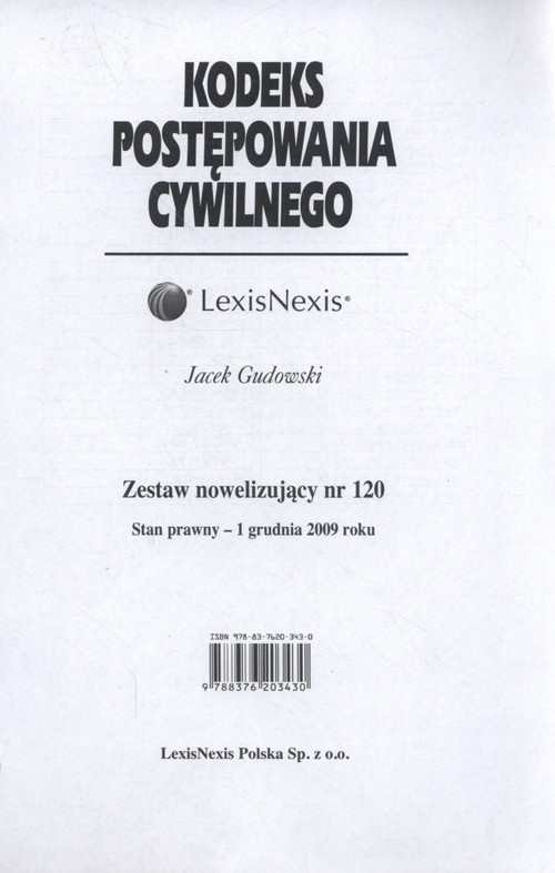Kodeks Postępowania Cywilnego Zestaw nowelizujący nr 120 Stan prawny 1 grudnia 2009 roku