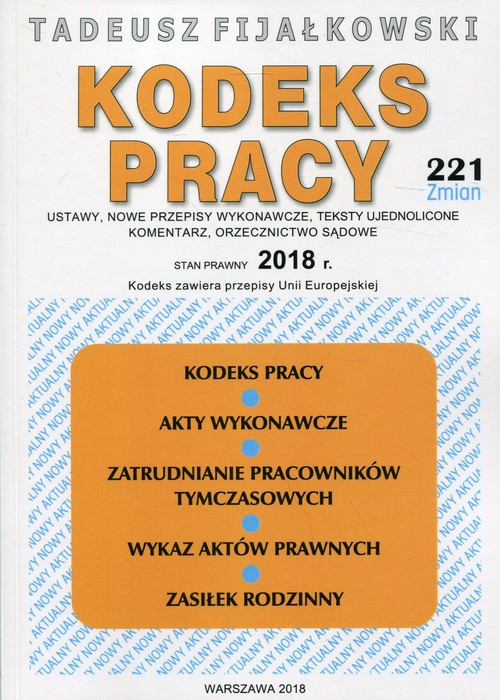 Kodeks pracy Akty wykonawcze Zatrudnianie pracowników tymczasowych Wykaz aktów prawnych Zasiłek rodzinny Ustawy, Nowe przepisy wykonawcze, teksty ujednolicone, komentarz, orzecznictwo sądowe. Stan prawny na 2018 r. Kodeks zawiera przepisy Unii Europejskiej.