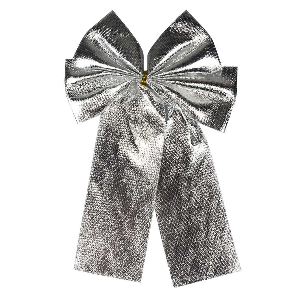 Duża kokarda dekoracyjna w kolorze srebrnym. Idealnie sprawdzi się w kompozycjach dekoracyjnych, świątecznych jak i do dekoracji prezentów. Ozdoba świąteczna o wymiarze: 15 x 23 cm.
