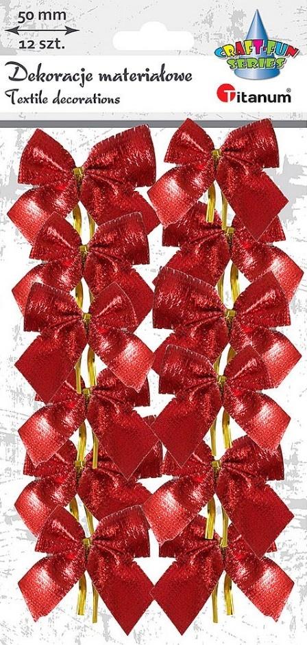 Gotowe kokardy, wykonane z materiału. Dla wygody każda z kokard wyposażona została w drucik ułatwiający jej dowiązanie do przedmiotu. Idealne do dekoracji choinek, gałązek, wianków, świeczników, prezentów. Szerokość: 50mm. 12 szt.