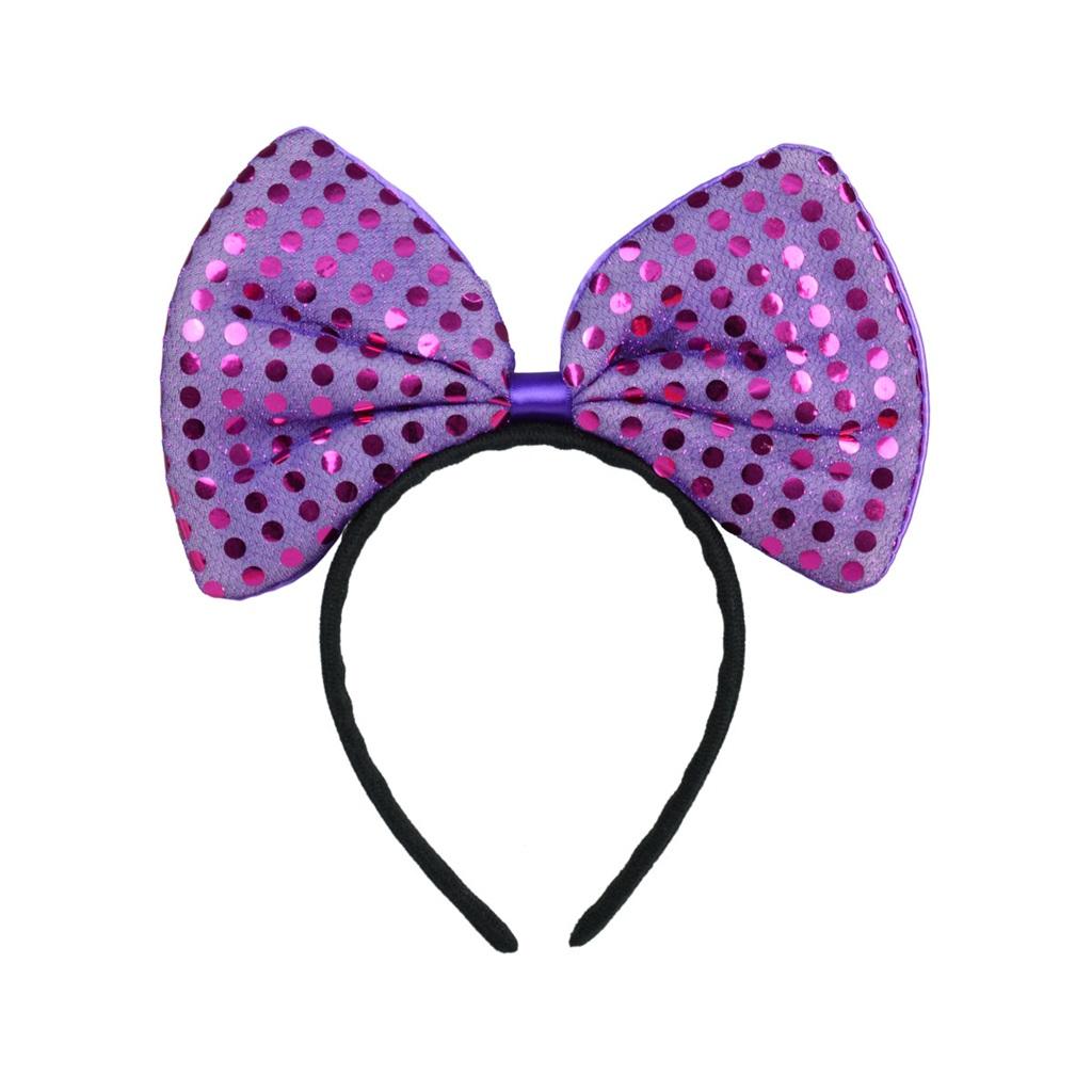 Fioletowa kokarda na opasce. Zdobiona jest połyskującymi kropeczkami. Idealne dopełnienie stroju na imprezę urodzinową, wieczór panieński lub zabawę karnawałową. Opaska wygodna w użytkowaniu, rozmiar uniwersalny. Rozmiar kokardy: 20 cm.
