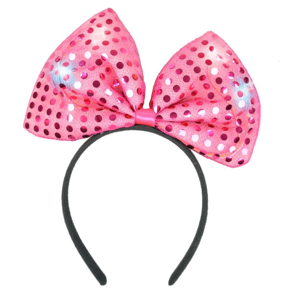 Duża kokarda na opasce z diodami led. Zdobiona jest połyskującymi kropeczkami. Wewnątrz kokardy znajdują się kolorowe diody led zasilane 3 bateriami guzikowymi typu AG10 lub LR44. Baterie nie są dołączone do artykułu. Idealne dopełnienie stroju na imprezę urodzinową, wieczór panieński lub zabawę karnawałową. Oryginalny gadżet na festiwale i koncerty. Dostępne różne warianty kolorystyczne. Rozmiar kokardy: 20 cm. Opaska wygodna w użytkowaniu, rozmiar uniwersalny.