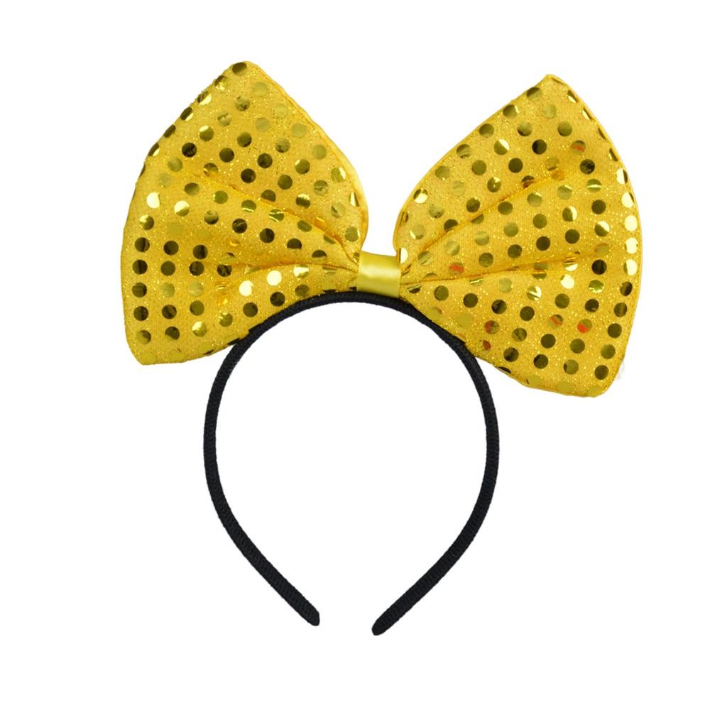 Żółta kokarda na opasce. Zdobiona jest połyskującymi kropeczkami. Idealne dopełnienie stroju na imprezę urodzinową, wieczór panieński lub zabawę karnawałową. Opaska wygodna w użytkowaniu, rozmiar uniwersalny. Rozmiar kokardy: 20 cm.