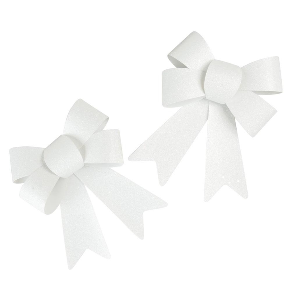 Zestaw dwóch kokard dekoracyjnych w kolorze białym. Produkt wykończony brokatowym zdobieniem - pięknie mieni się w świetle. Idealnie sprawdzi się w kompozycjach dekoracyjnych, świątecznych jak i do dekoracji prezentów. Wymiary jednej kokardy to 13,5x17,5 cm.