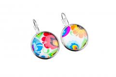 Wzór łowicki na kolczykach ludowych to barwne kwiaty z łowickiej wycinanki na białym tle. Wzór ten inspirowany jest tradycyjnym wzorem ludowym z regionu łowickiego. Elementem przewodnim na łowickich wycinankach są koguty, pawie oraz motywy kwiatowe. Więcej informacji o łowickich wycinankach znajdziesz na naszym blogu magazyn.folkstar.pl