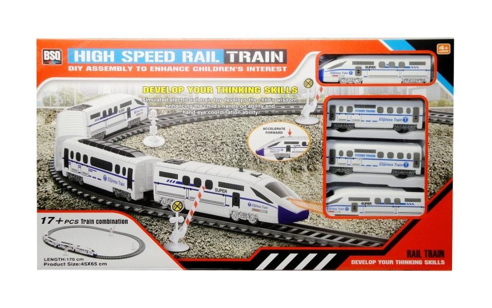 Plastikowa kolejka szynobus wraz z torami, 4 wagonami i znakami drogowymi. Zestaw składa się z 17 części. Tory mają 170 cm długości. Zabawka działa na baterie typu AAA. Baterie nie są załączone do zabawki Produkt zapakowany w kartonowe opakowanie z przezroczystym okienkiem. Podane wymiary są wymiarami opakowania. Zabawka dla dzieci od 4 lat.