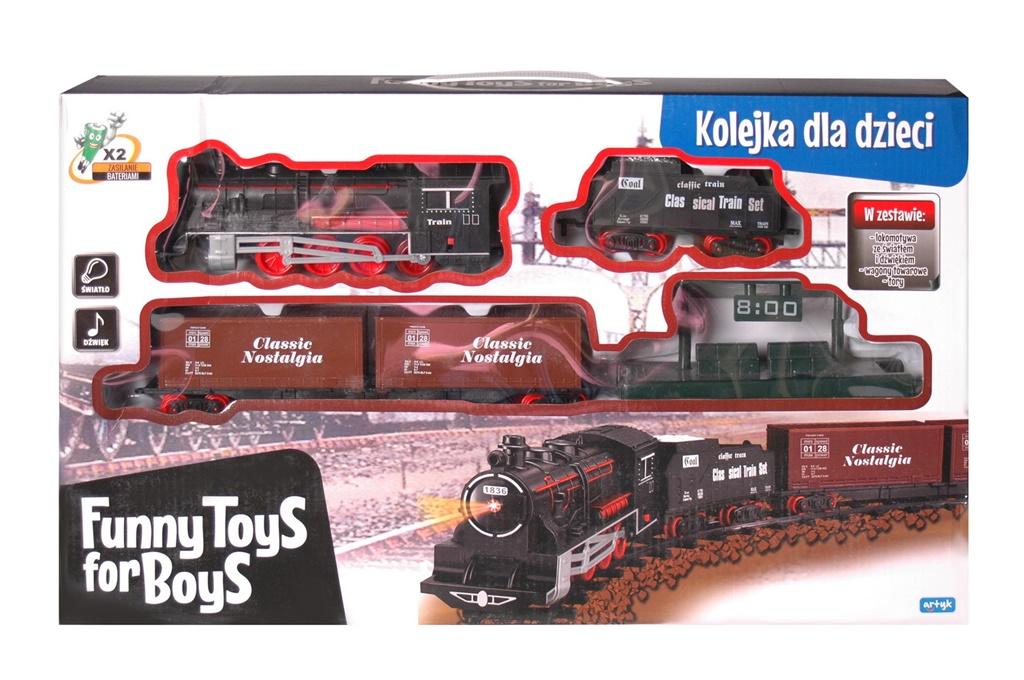 Pocią ze światełkiem i dźwiękiem i torach o średnicy 74 cm. Zestaw zawiera 16 elementów w tym 12 części torów, a pociąg zasilany jest 2xAA. Włącznik efektów świetlnych i dźwiękowych znajduje się z boku lokomotywy.