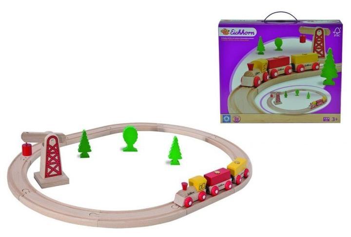 Drewniana kolejka z elementami torów, wagonów, z figurkami i akcesoriami, FSC® 100%, drewno bukowe.