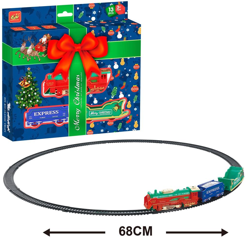 Pociąg-kolejka na baterie w zestawie z torami do złożenia w kształt koła o średnicy 68cm. Ogromną zaletą jest opakowanie, które wygląda jak prezent świąteczny.