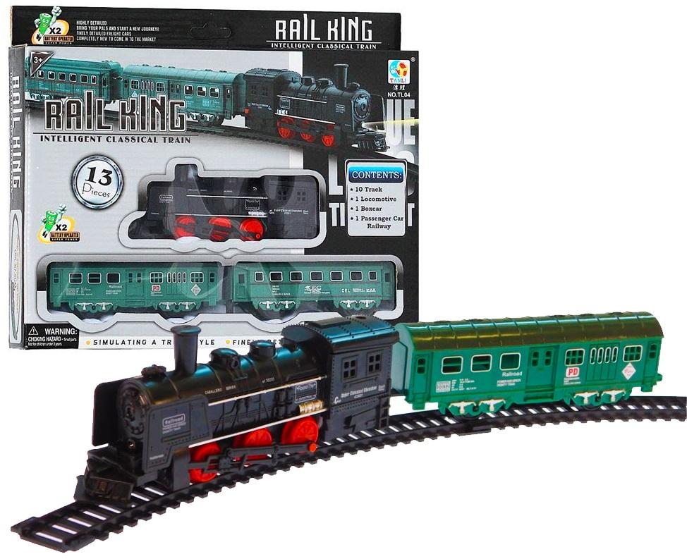 Lokomotywa na baterie z dwoma wagonami i zestawem torów.